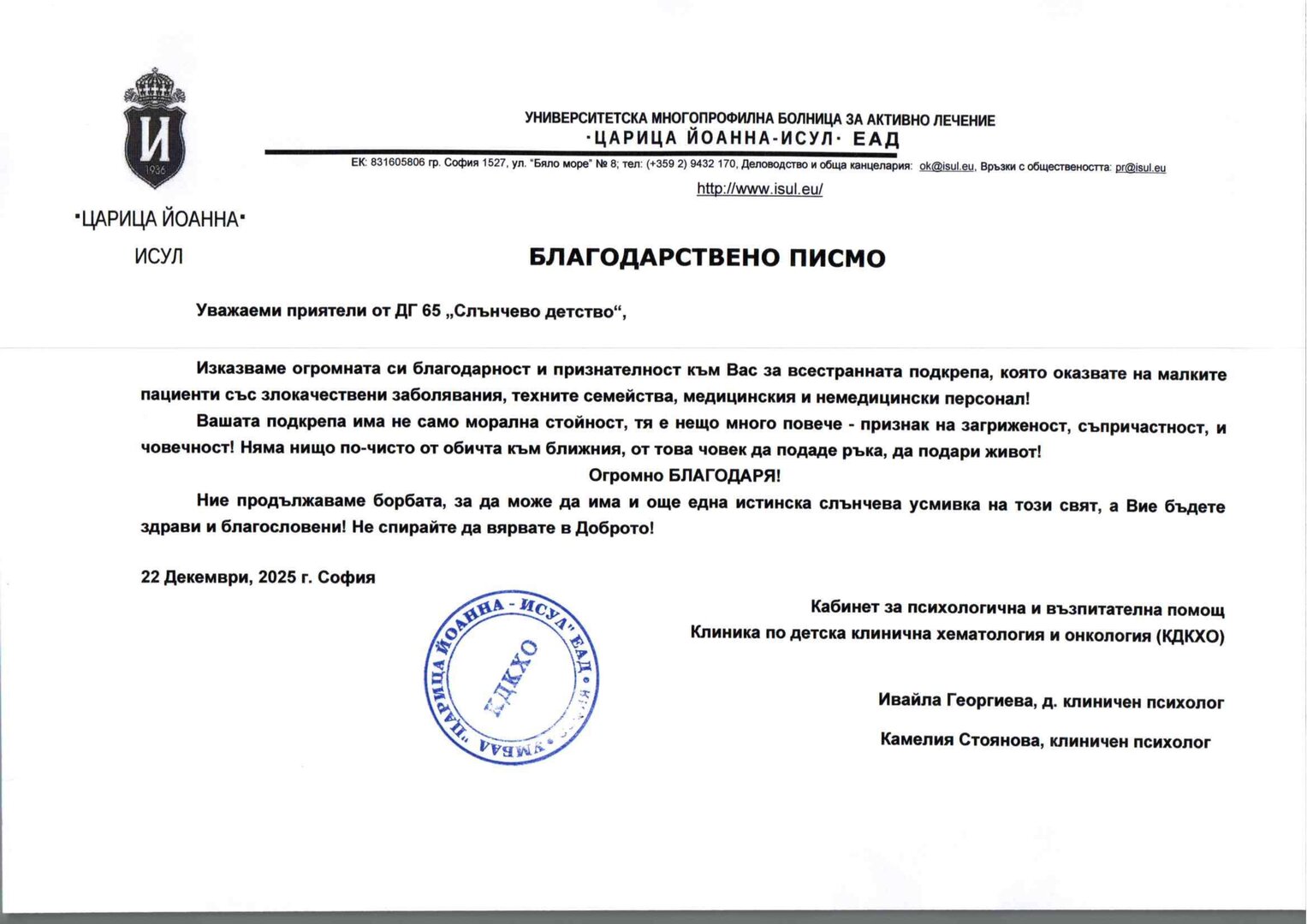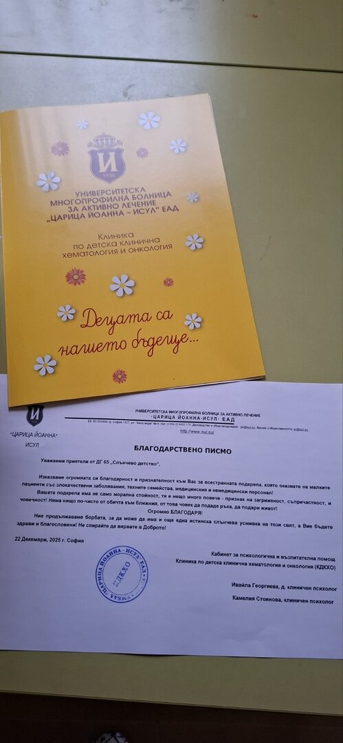 Благодарение на ангажираността и съпричастността на общността на ДГ №65 „Слънчево детство“, и тази година беше реализирана благотворителна инициатива в подкрепа на децата от онкохематологичното отделение в ИСУЛ. Те получиха не само подаръци, а внимание и подкрепа.