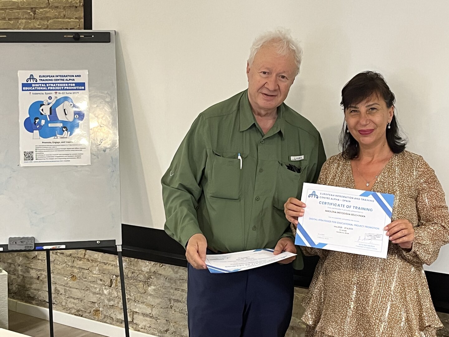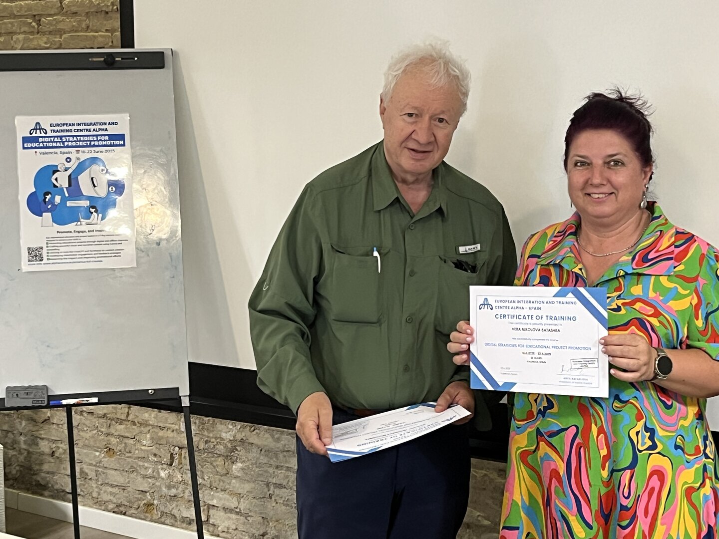 От 16 до 22 юни 2025 трима педагогически специалисти от ДГ 65 „Слънчево детство“ участваха в структуриран курс на тема „Дигитални стратегии за популяризиране на образователни проекти“, проведен в град Валенсия, Испания. Основните теми, с които се запознаха нашите колеги, бяха свързани с изграждането на ефективни комуникационни стратегии за популяризиране на образователни проекти, използването на социални мрежи, уебсайтове и бюлетини за достигане до различни аудитории, както и създаването на визуално съдържание чрез платформи като Canva и Sway. Акцент в обучението бе ролята на изкуствения интелект за създаване на промоционални текстове, изображения и видеа, както и методи за измерване на въздействието на дигиталните кампании. В рамките на курса участниците разработиха цялостен промоционален план за дейностите на детската градина, който включваше използване на онлайн и офлайн инструменти, стратегии за ангажиране на заинтересовани страни и събиране на обратна връзка за устойчивост на резултатите. Обучението се проведе от организацията European Integration and Training Centre ALPHA.