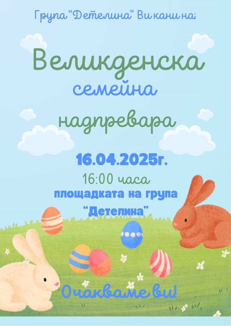 На 16 април 2025 г. площадката на група „Детелина“ оживя от радостни усмивки и детски смях по време на организираната Великденска надпревара. В събитието се включиха децата от групата и техните родители, които заедно участваха в редица весели състезателни игри.