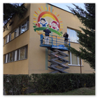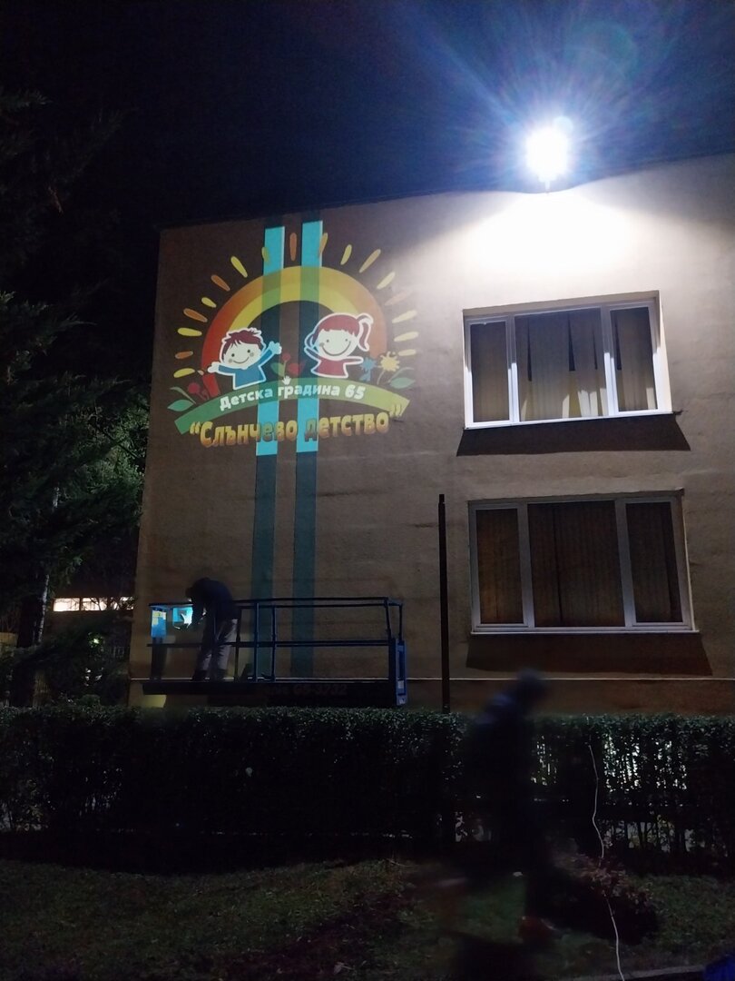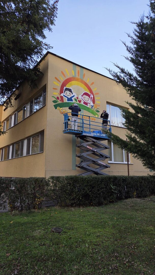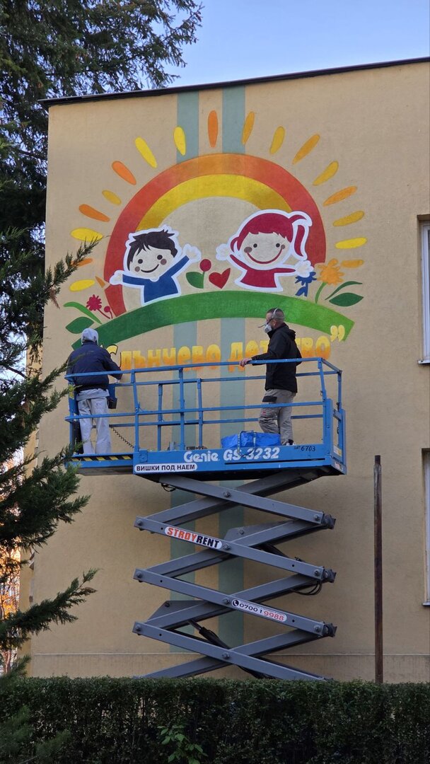 С радост споделяме, че фасадата на ДГ 65 „Слънчево детство“ беше обогатена с красиво изрисуваното ново лого на нашата детска градина. Екип от художници работи по създаването на цветното изображение, което вече посреща децата, родителите и всички гости още от входа на сградата.